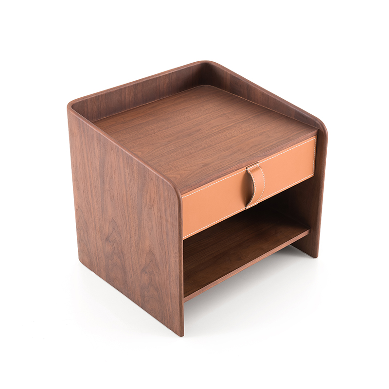 A walnut veneer micro leather night stand gives the ultimate use of a leather handed drawer and a vacuum-shaped storage piece that enrich an bedroom setting.