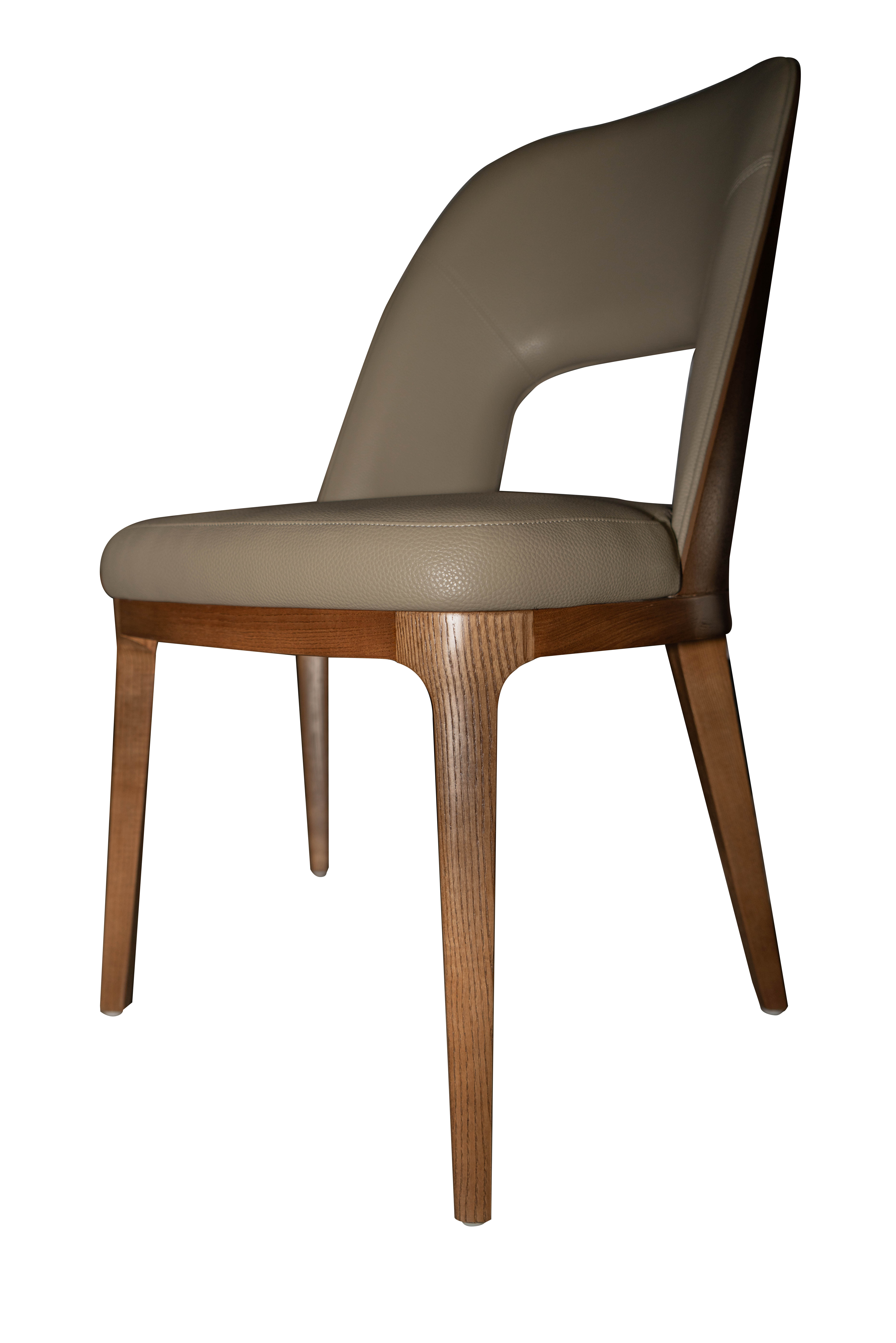 A contemporary dining chair that adds a luxe touch thanks to leather upholstery. The wooden dowel legs keep the look accessible with a little mid-century inspiration.