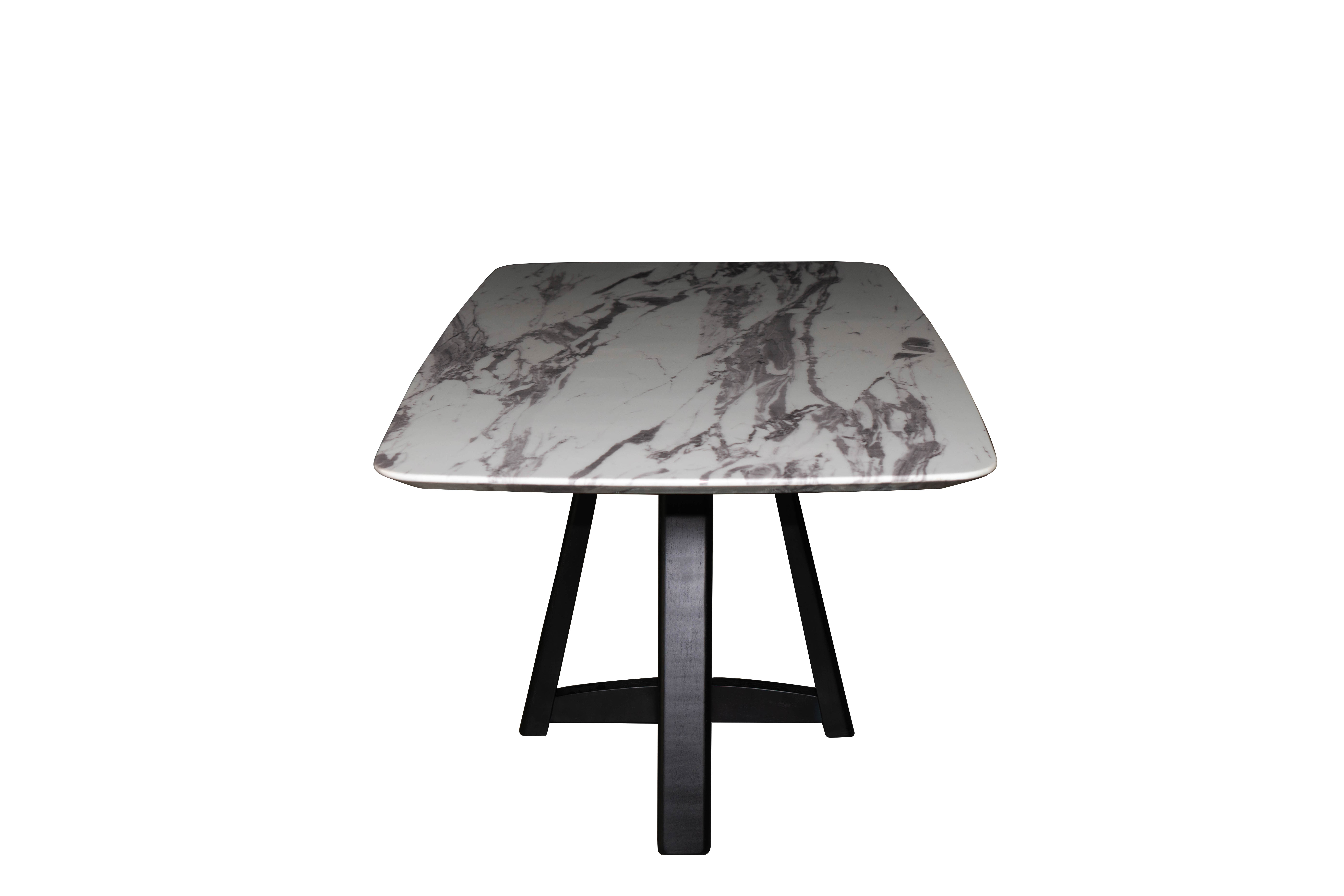 A slab of natural marble gives this dining table a rustic look, while curved and cutout wooden base bring a more contemporary feel. A conversation-starter you will love to entertain around!