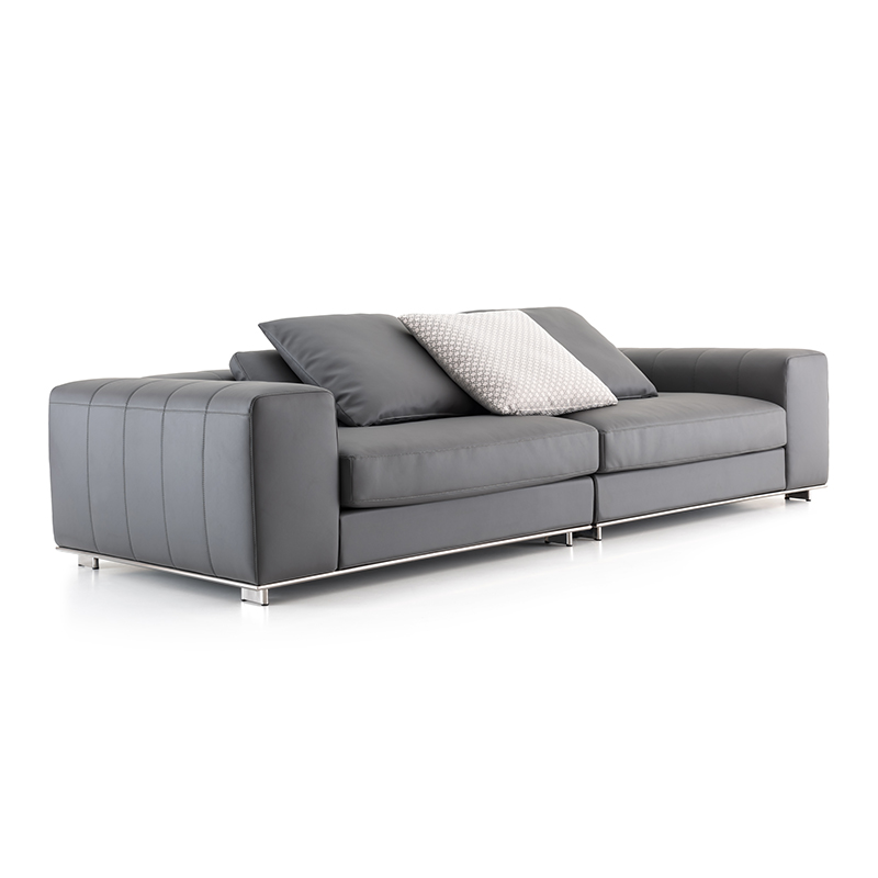 Full grey Italian leather sofa provide a subtle counterpoint to the stainless steel feet for this radiant piece with a shape of three wide seats that reflects the comfortable side picturesque piece.